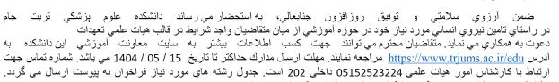 دانشگاه علوم پزشکی تربت جام اقدام به جذب هیات علمی تعهد خدمت در سال 404 نموده است