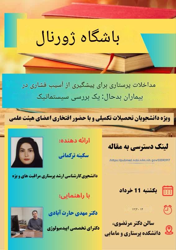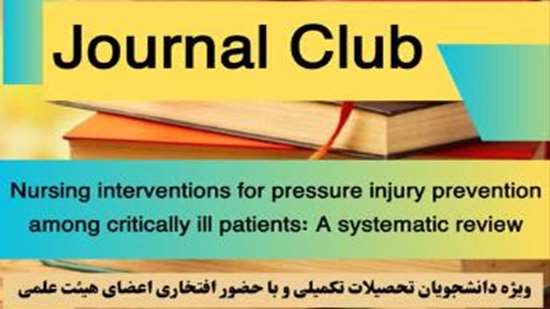 سکینه ترکمانی دانشجوی تحصیلات تکمیلی با راهنمایی دکتر مهدی حارث آبادی، ژورنال کلاب مداخلات پرستاری برای پیشگیری از آسیب فشاری در بیماران بد حال را که یک بررسی سیستماتیک می باشد را در روز یکشنبه یازده خرداد ارائه می دهد