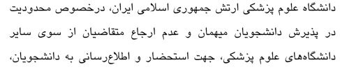 عدم پذیرش دانشجوی انتقال و میهمان از سوی دانشگاه ارتش گروه خبری : اخبار ویژه,آخرین اخبار کد خبر : 57391 کپی لینک کلمات کلیدی