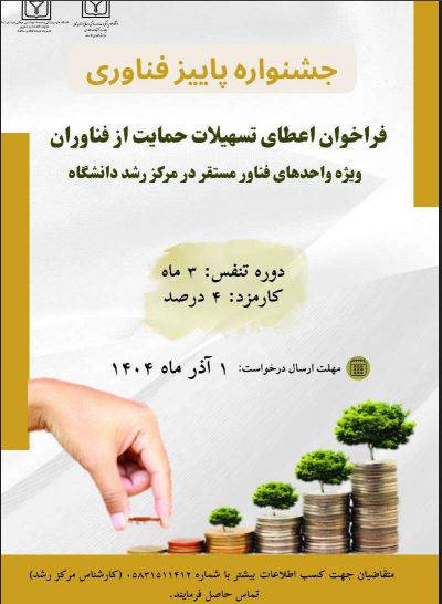 معاونت تحقیقات و فناوری دانشگاه، در راستای توسعه فناوری سلامت و حمایت از واحدهای فناور مرکز رشد، در نظر دارد جشنواره "پاییز فناوری" را جهت اعطای تسهیلات حمایتی برای واحدهای فناور پذیرش شده در مرکز رشد دانشگاه برگزار نماید. متقاضیان گرامی جهت کسب اطلاعات بیشتر می‌توانند با شماره تلفن‌های 05831511412 و 05831511404 تماس حاصل فرمایند.