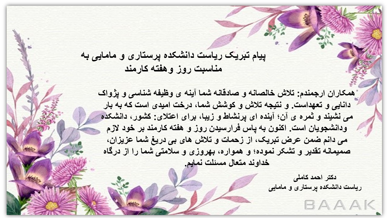 پیام تبریک دکتر احمد کاملی، ریاست محترم دانشکده پرستاری و مامایی به مناسبت روز و هفته کارمند