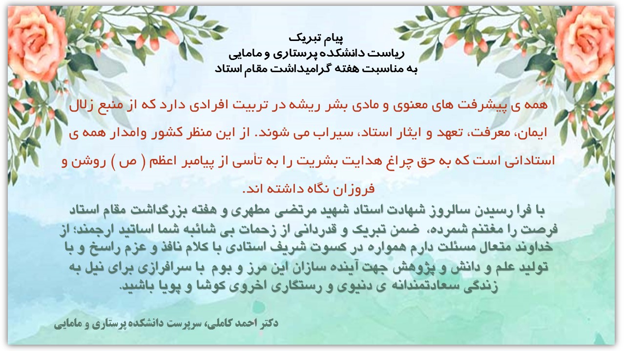 پیام تبریک دکتر احمد کاملی؛ سرپرست محترم دانشکده پرستاری و مامایی به مناسبت روز معلم و هفته بزرگداشت مقام استاد گروه خبری : اخبار ویژه,آخرین اخبار کد خبر : 53848 کپی لینک کلمات کلیدی