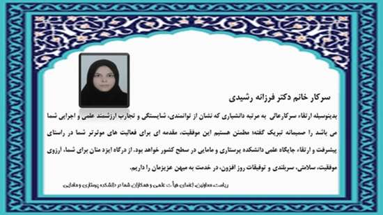 بدینوسیله ارتقاء سرکارعالی به مرتبه دانشیاری که نشان از توانمندی، شایستگی و تجارب ارزشمند علمی و اجرایی شما می باشد را صمیمانه تبریک گفته؛ مطمئن هستیم این موفقیت، مقدمه ای برای فعالیت های موثرتر شما در راستای پیشرفت و ارتقاء جایگاه علمی دانشکده پرستاری و مامایی در سطح کشور خواهد بود. از درگاه ایزد منان برای شما، آرزوی موفقیت، سلامتی، سربلندی و توفیقات روز افزون، در خدمت به میهن عزیزمان را داریم.