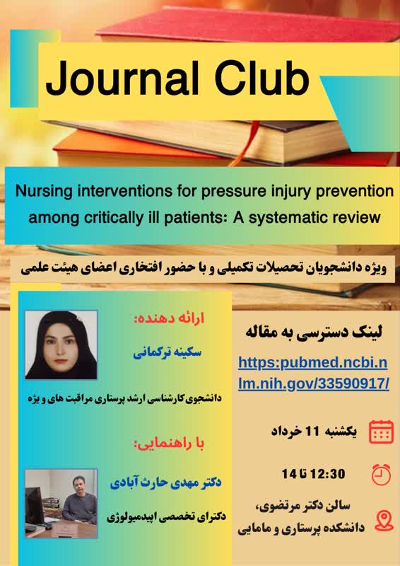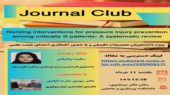 سکینه ترکمانی دانشجوی تحصیلات تکمیلی با راهنمایی دکتر مهدی حارث آبادی، ژورنال کلاب مداخلات پرستاری برای پیشگیری از آسیب فشاری در بیماران بد حال یک بررسی سیستماتیک را ارائه می دهد