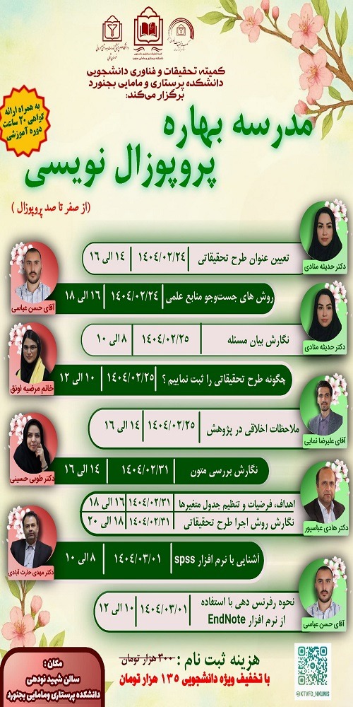 کمیته تحقیقات و فناوری دانشجویی دانشکده پرستاری و مامایی؛ مدرسه بهاره پروپوزال نویسی را برگزار می کند، در این مدرسه از صفر تا صد چگونگی نوشتن یک پروپوزال توسط اعضای هیات علمی دانشکده پرستاری و مامایی و در چهار روز تدریس می شود.