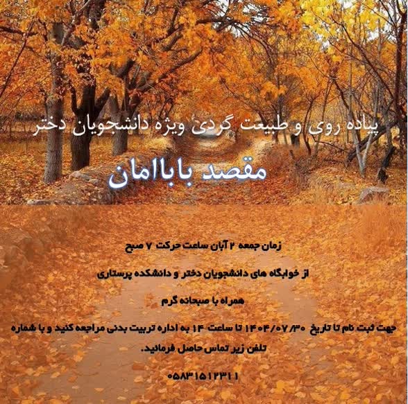 نظر به اهمیت ورزش در ایجاد شور و نشاط همایش پیادهروی کاروان نشاط و سلامت ویژه دانشجویان دختر به مقصدبابا امان برگزار میشود.