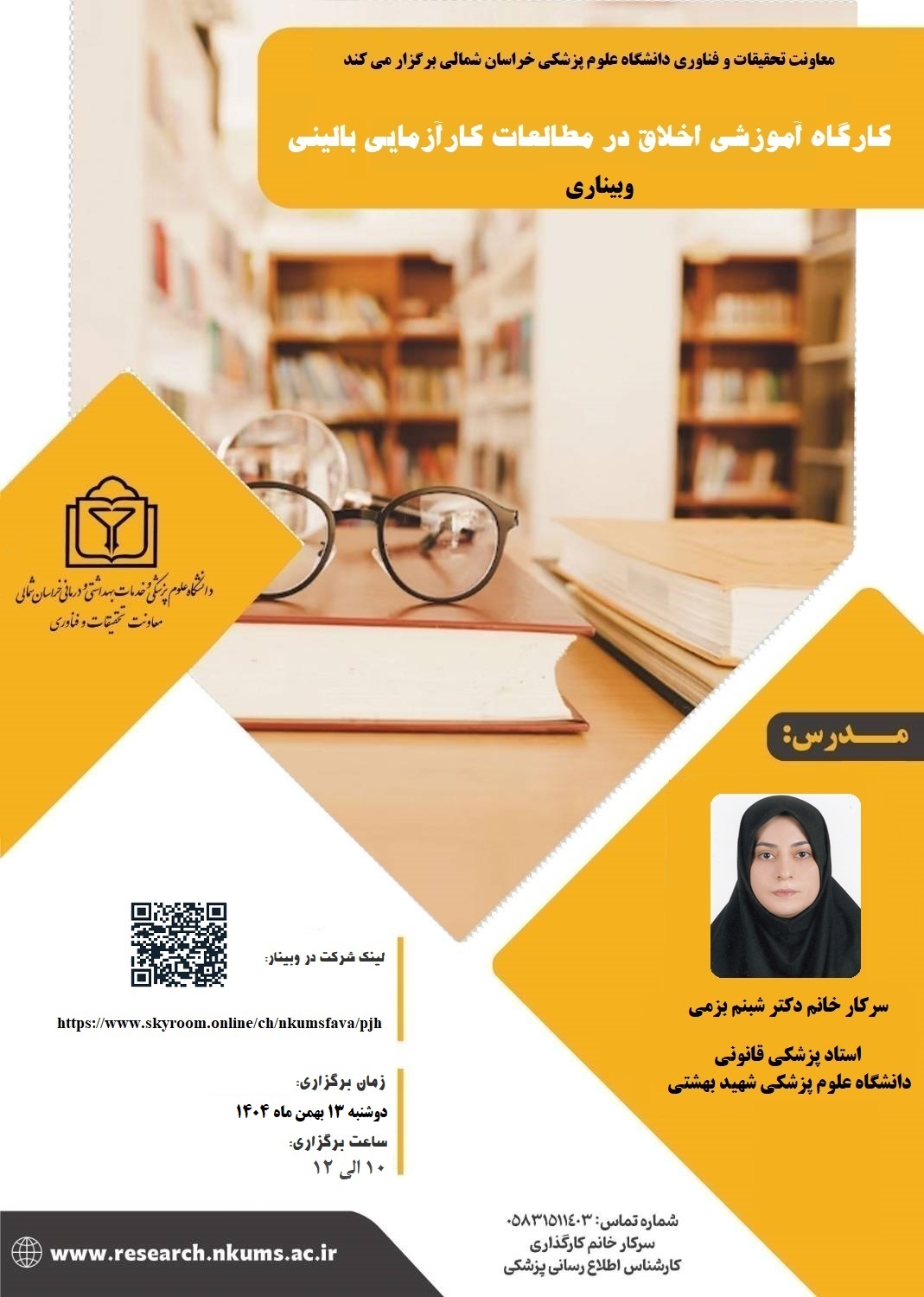 کارگاه آموزشی" اخلاق در مطالعات کارآزمایی بالینی" در تاریخ 13 بهمن 1404 ساعت 10 الی 12 ویژه اعضای هیات علمی، پژوهشگران و دانشجویان تحصیلات تکمیلی با تدریس سرکار خانم دکتر بزمی به صورت وبیناری برگزار خواهد شد.