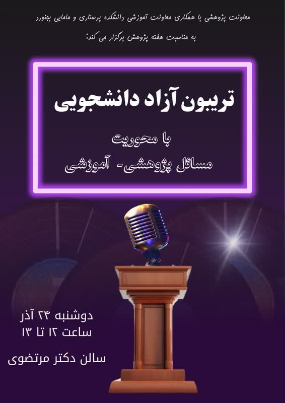 هر ساله هفته آخر آذر، به نام هفته پژوهش و فناوری نام گذاری می گردد که امسال با شعار سرمایه گذاری در تولید با پشتوانه پژوهش و فناوری از روز یکشنبه 22 آذر شروع و تا پنجشنبه 27 آذر ادامه دارد. دکتر مریم باقری، معاون پژوهشی در این خصوص اظهار داشت: که معاونت در نظر دارد با همکاری معاونت آموزشی، برنامه های متنوعی شامل مسابقه طراحی پوستر و کاریکاتور با موضوع پژوهش با هوش مصنوعی تا تریبون آزاد دانشجویی و هم اندیشی اساتید را برگزار نماید؛ لذا از دانشجویان و اساتید محترم دعوت می شود، اطلاع رسانی های متعاقب در این خصوص را دنبال نمایند.